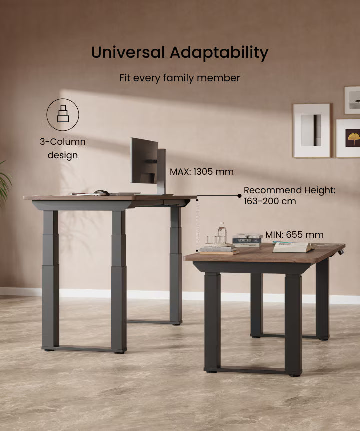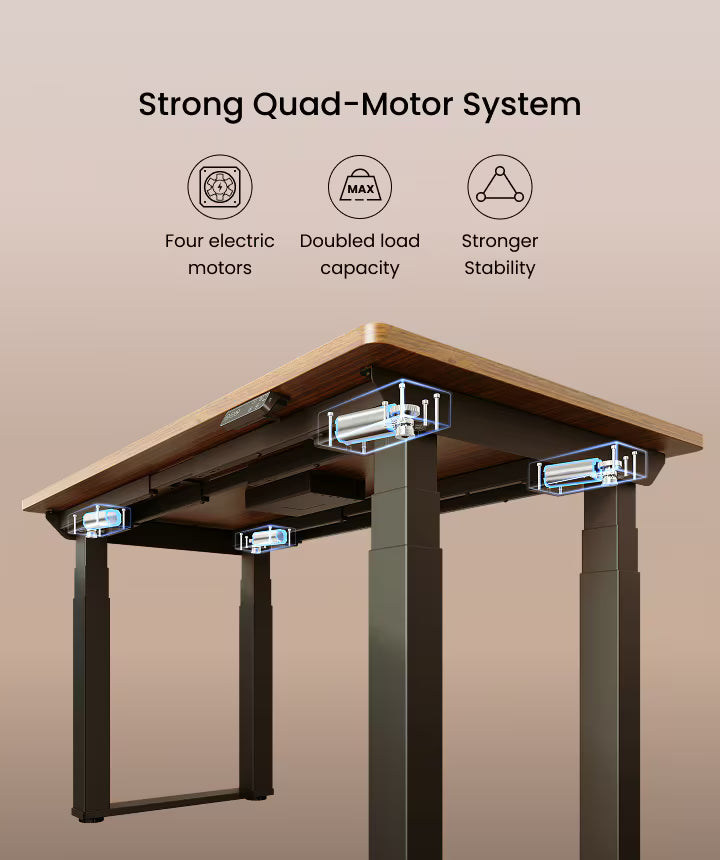 Four motors provide superior power and stability, allowing for higher weight capacity and smoother height changes compared to dual motor systems. This results in quieter operation, less vibration, and a desk that feels solid and reliable during every adjustment.