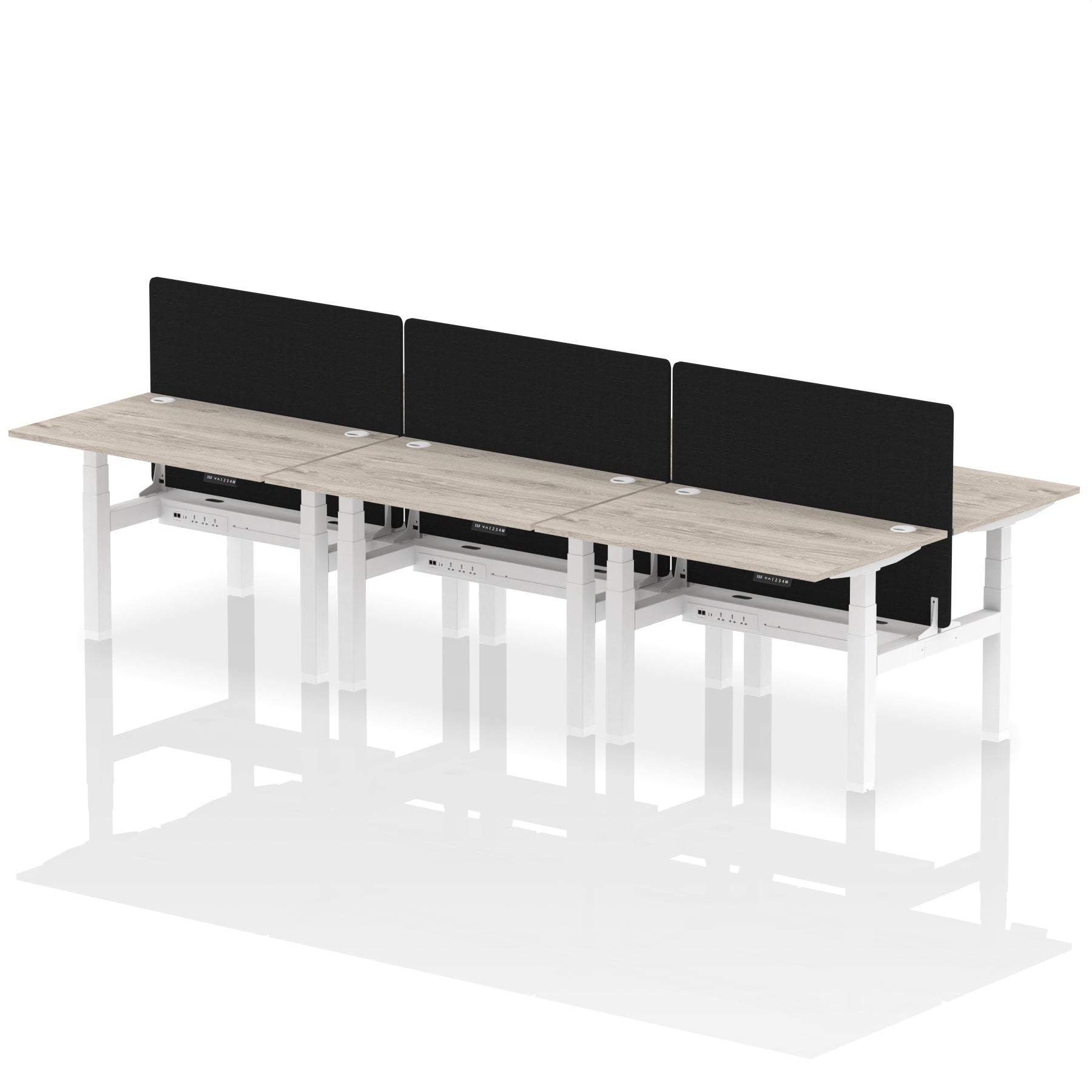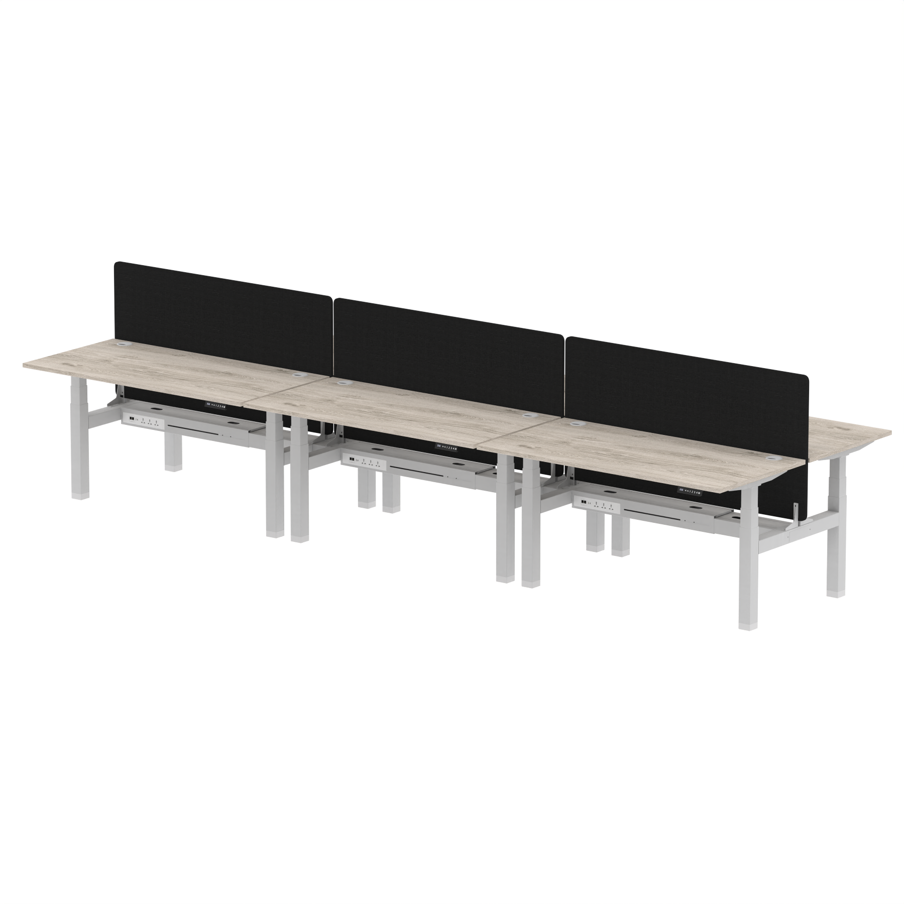 Elevate your office with the Air Back-to-Back Height Adjustable Desk for six, a blend of ergonomics and connectivity. Each desk includes two Cat 6 Ethernet ports, a USB and USB-C port, and three UK plugs, complemented by integrated cable ports for a clean setup. The addition of a dividing screen per duo offers privacy and focus. This desk is a perfect match for professionals seeking a tidy, tech-friendly, and adaptable workspace.