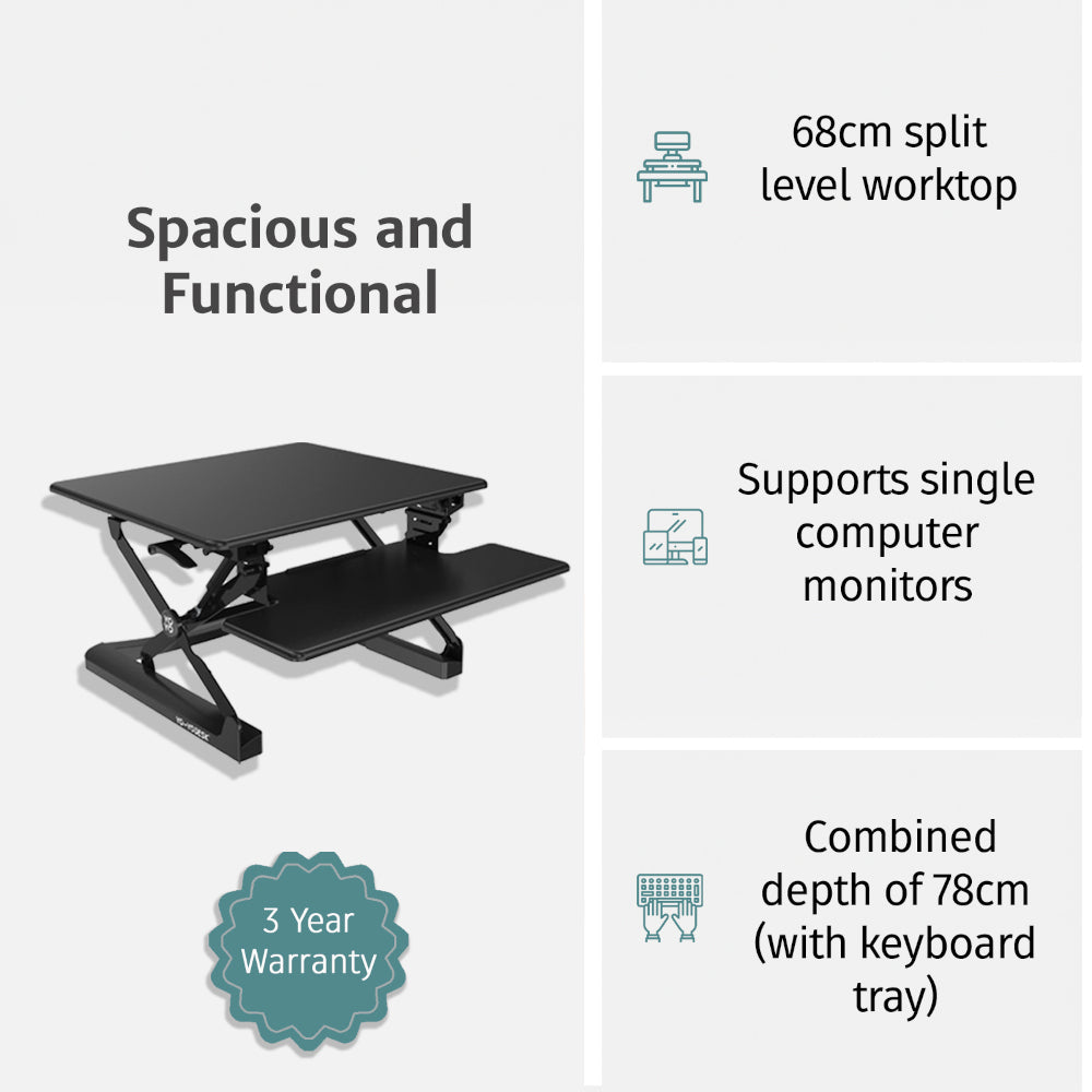 Our Yo-Yo DESK® CLASSIC standing desk converters feature deeper desktop space. Yo-Yo DESK® 70(formally MINI) can accommodate your entire workstation. Elevate single screen monitors, with greater top space and a very sturdy tabletop to cater for extra items totalling up to 15 kg.