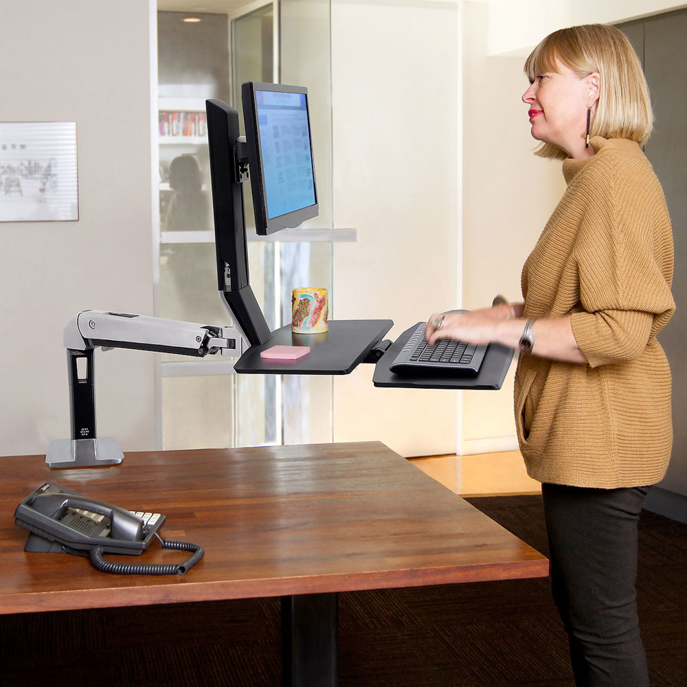 Constant Force™ counterbalanced mechanism moves both monitor and keyboard together across a 51 cm vertical range—no motors, electricity, or tools needed.